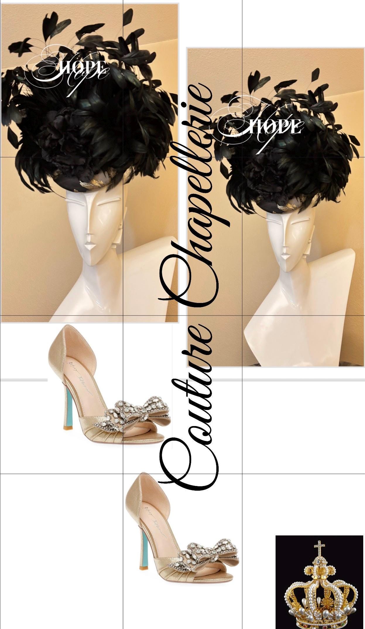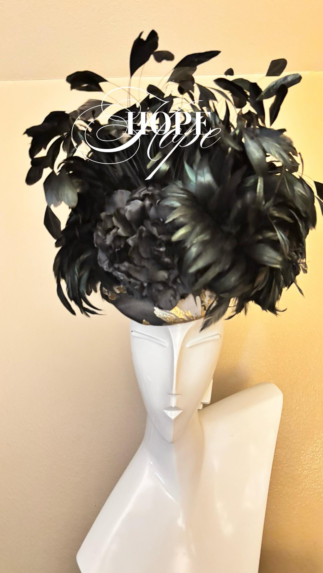 This Haute creation is from our latest collection, BORNFREE-MADEMOISELLE. The design was created with a selection of varied beautiful black feathers accompanied by a black silk flower on a black and gold blocked base.